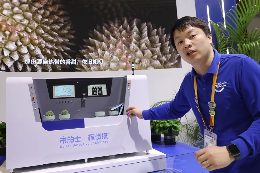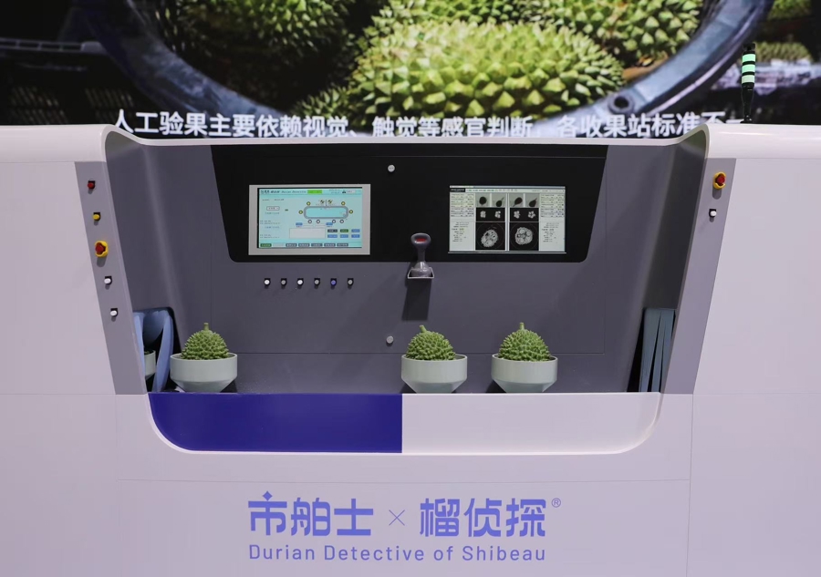 在第八届进博会8.1馆,市舶士榴莲展台,“榴侦探”无损智检系统流水线模型一亮相就火了,背后的大屏幕上显示着榴莲们的“体检报告”,果肉有几房,是否有虫子入侵,清晰可见。