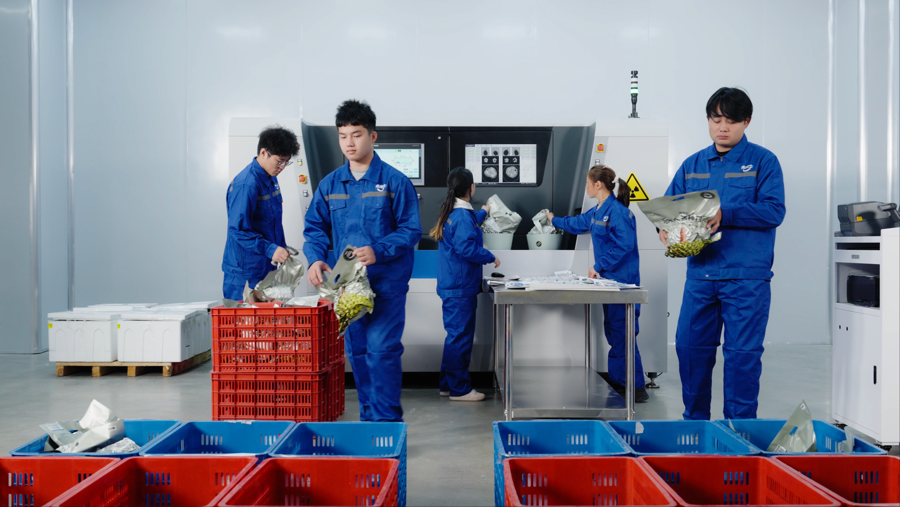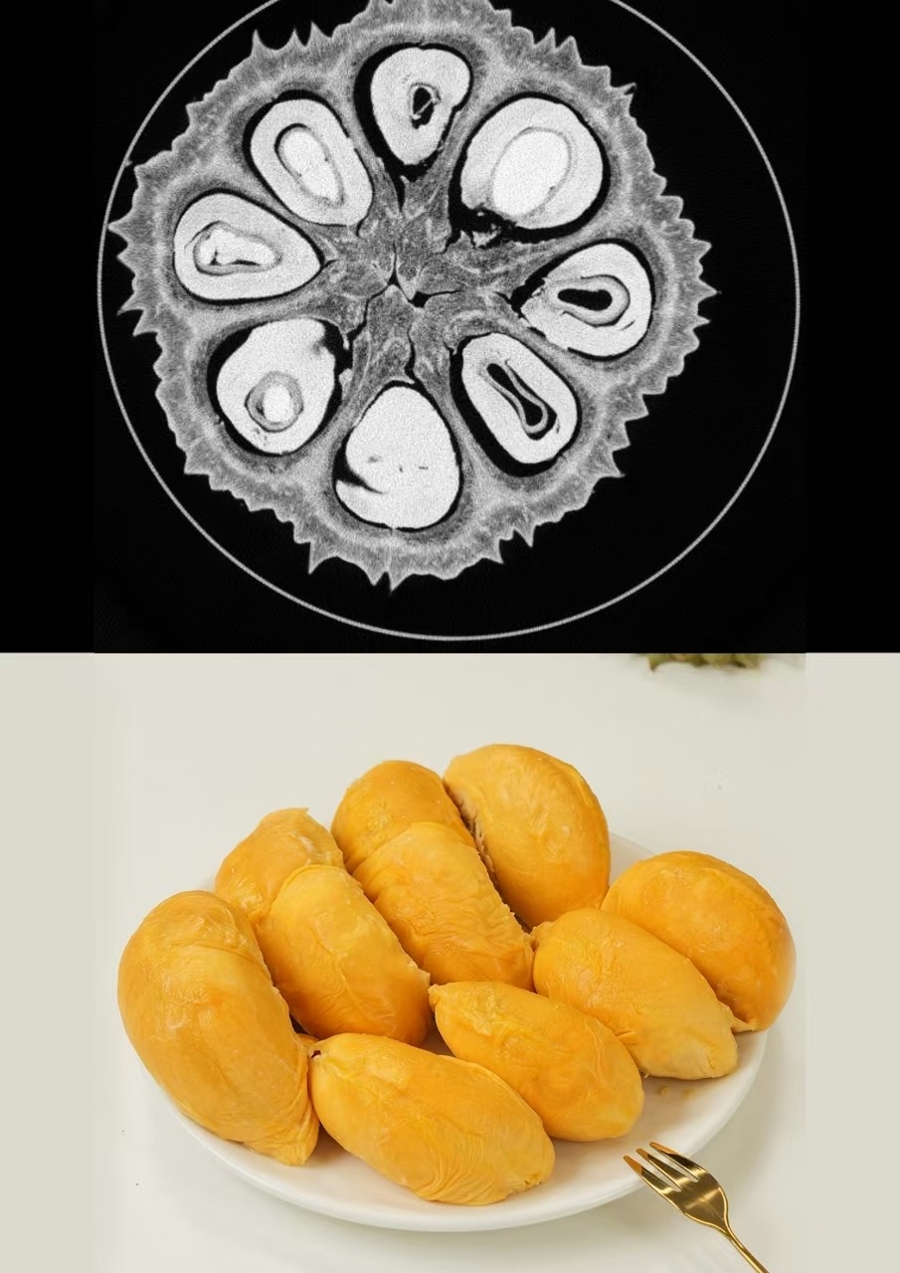 经过近一年打磨,“榴侦探”无损智检系统上线。一颗榴莲被放置在容器内,2颗一组,仅需24秒,就能在机器中完成一次“转圈舞”。通过高精度CT扫描技术,对榴莲内部结构进行360°成像,如同为榴莲打造透视视角,并利用人工智能算法,基于海量榴莲品质数据训练模型,对CT图像进行多维度解析。果肉有几房、每房有多重、果核是大是小、是否有“烧果”、最大横截面多少、是否有虫害、是否经历过化冻又复冻的过程……13项指标,共同构成一份完整的“体检报告”,形成全面的品质评估报告。