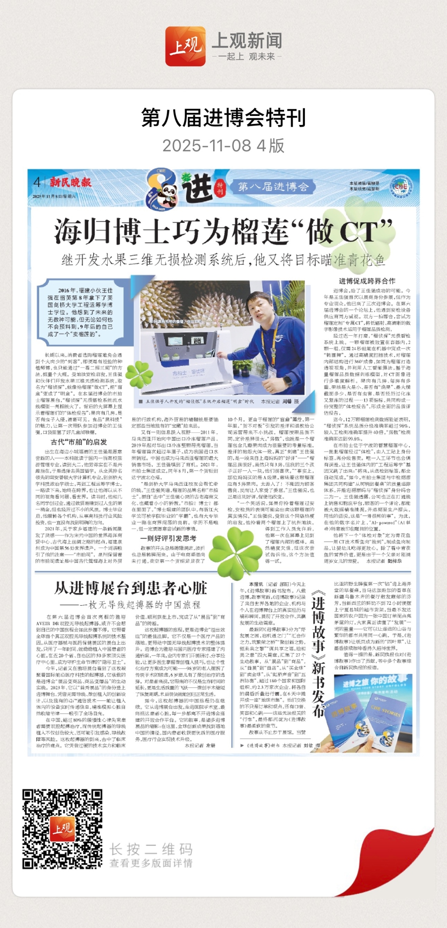 今年是王佳强第一次以展商身份参展,但是,作为专业观众,王佳强已经来了三届进博会。在第六届进博会的一次论坛上,他遇到了安检设备供应商同方威视。双方一拍即合,尝试为榴莲定制“专属CT”,将低辐射、高清晰的数字影像技术运用于榴莲品质检测。
