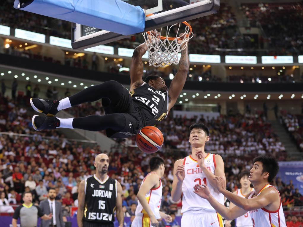 约旦队球员塔克(上)在比赛中扣篮得分(资料图)。新华社记者 徐子鉴 摄